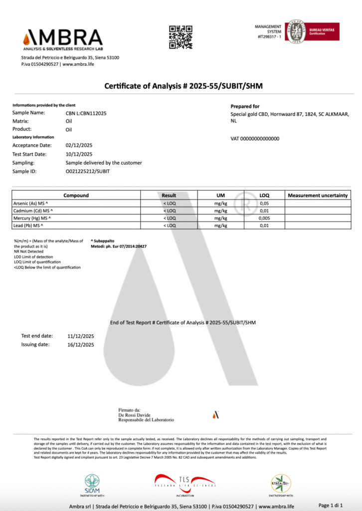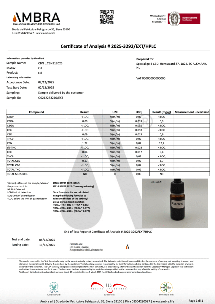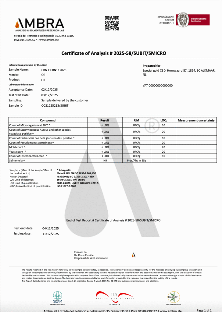 L’olio di CBN® Special Gold CBD Full Spectrum® è supportato da analisi complete che ne attestano potenza, purezza e sicurezza, rendendolo una soluzione ideale per chi cerca un supporto naturale serio, affidabile e di alto livello.