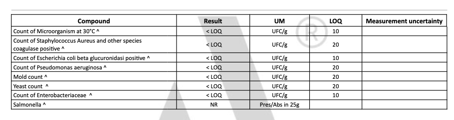 Oltre al contenuto in cannabinoidi, la qualità di un olio dipende anche dalla sua sicurezza microbiologica. Le analisi batteriologiche, eseguite secondo norme ISO ufficiali, confermano un risultato eccellente.
